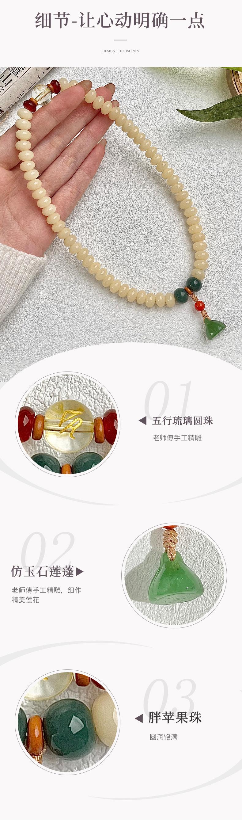 CN: 天然菩提子+合金五行珠;避免接触化学品,用软布擦拭保存灵性光泽。